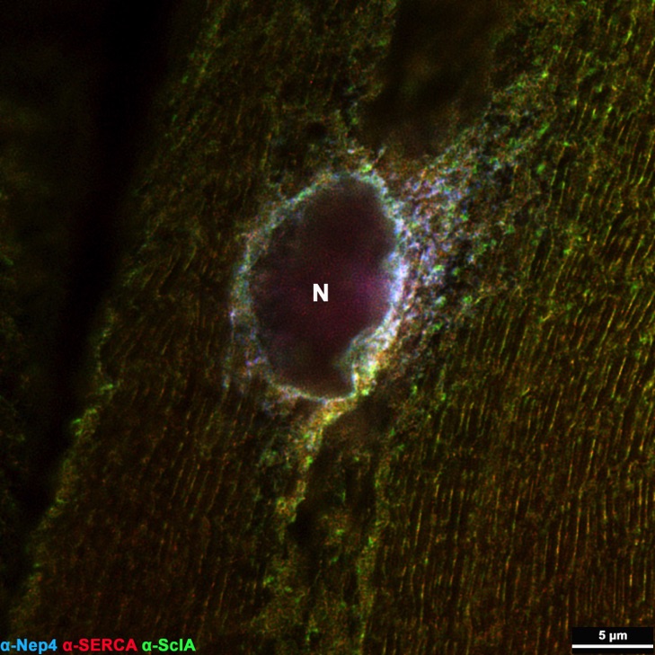 STED-based triple labeling of Nepilysin4, SERCA, and Sarcolamban in 3rd instar larval body wall muscles confirms co-localization of all factors in distinct membrane microcompartments of the sarcoplasmic reticulum, particularly around the nucleus (N).